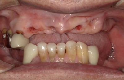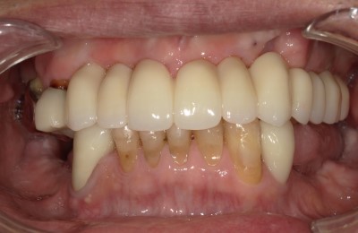 | 治療方法 | インプラントを6本埋入し、その上部をセラミックで作りしっかり咬めるようにした。 |