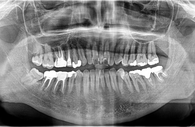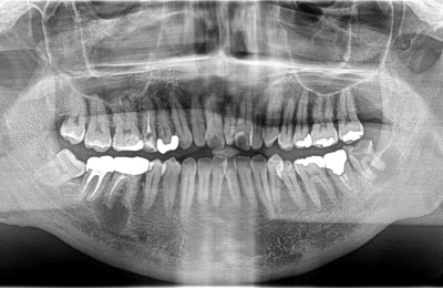 | 治療方法 | 右下6番目、左下8番目の歯に大きな根尖病変(膿の袋)が認められる。また、右上6番目にも根尖病変、右上5番目に不良な根管充填が認められる。 ラバーダム防湿および拡大視野下にてそれぞれ精密根管治療を行った。 |
